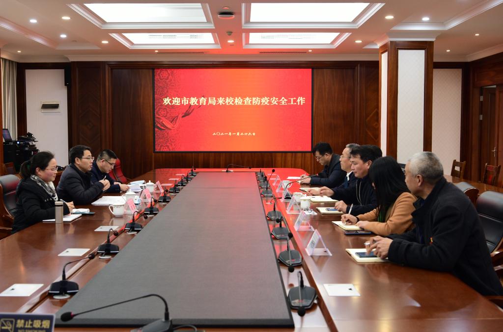 2021年1月26日下午,市教育局党委委员、总督学邵伟康,带领高教处相关同志,莅临我校检查和指导寒假防疫工作,学校校长郑能波、副校长孔志华、防控专班成员全程陪同检查。