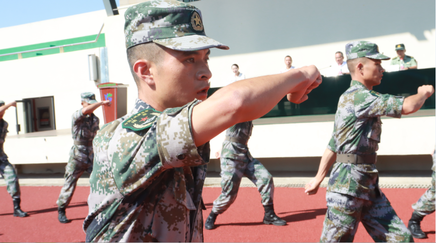 承训教官进行了队列、军体拳等科目示范表演,动作整齐划一、干净利落,展现了当代军人过硬的军事技能,也给同学们树立了学习榜样和目标。教官代表周科健军士希望同学们在军训期间要严格要求自己,克服困难,努力拼搏;学会关心集体、关爱他人;认真总结,及时深化心灵深处的精神力量。来自旅游学院的孙嘉韦发言,她表示在军训中要发扬不怕苦、不怕累的精神,一切行动听从指挥,并做出了“刻苦训练、服从安排”的郑重承诺,表达了圆满完成军训任务的决心与斗志。