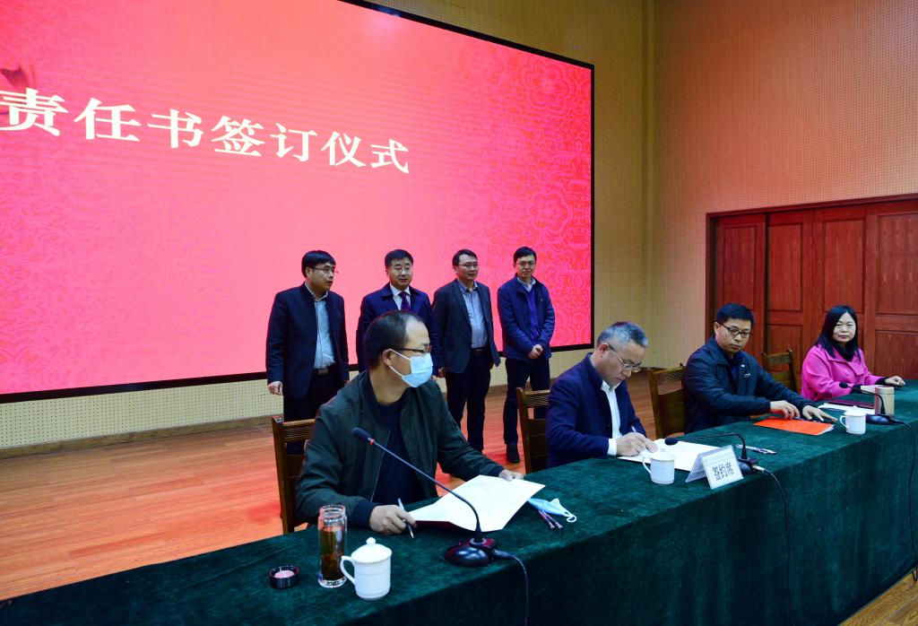 会议举行了省双高建设任务承担单位责任书签订仪式。办公室、人事处、教务处、旅游学院、图书信息中心、外事办公室等相关院、部负责人上台同郑能波校长签订了责任书。