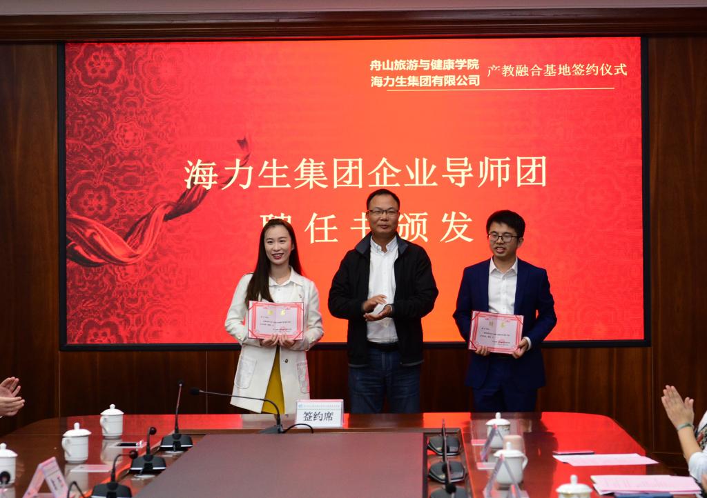 我校党委组织部长、商务学院党总支书记胡炳波为海力生集团食品事业部副总经理胡艺、团委副书记翁杰颁发企业导师聘任书。