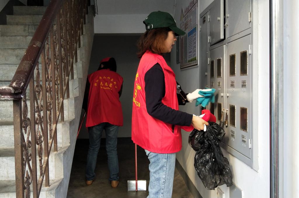 党员师生志愿者们分工合作,拿着扫帚、带着抹布、拎着水桶,以两人为一组,打扫楼道卫生,清除墙面上的小广告,清洗楼道内楼梯扶手、消防设施、水电表设施、牛奶箱。大家一边清理一边向群众开展宣传,同时号召大家积极抵制胡乱张贴小广告的行为,用自己的行动维护好城市的洁、净、美,努力做文明传播的使者。