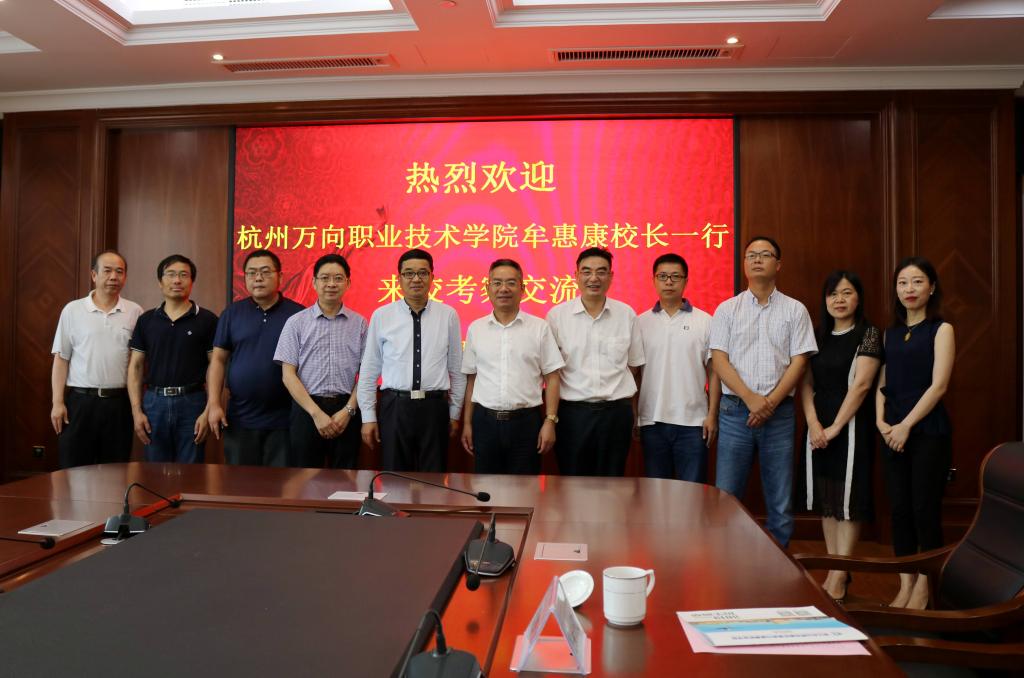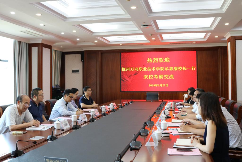 6月27日下午,杭州万向职业技术学院在校长牟惠康教授带领下,来我校开展考察交流。学校校长郑能波、副书记王旭光及相关部门负责人参加交流会。