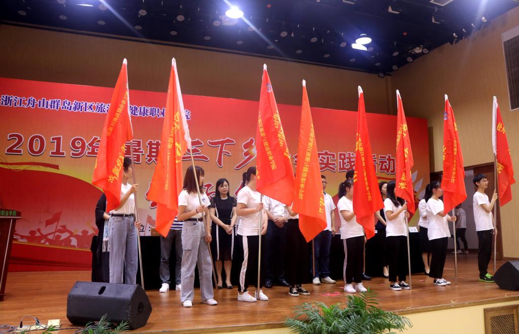 随后,教务处杨奇美老师宣读2019年暑期社会实践重点团队和一般团队的队伍名单,各位领导为本次出征团队授旗。