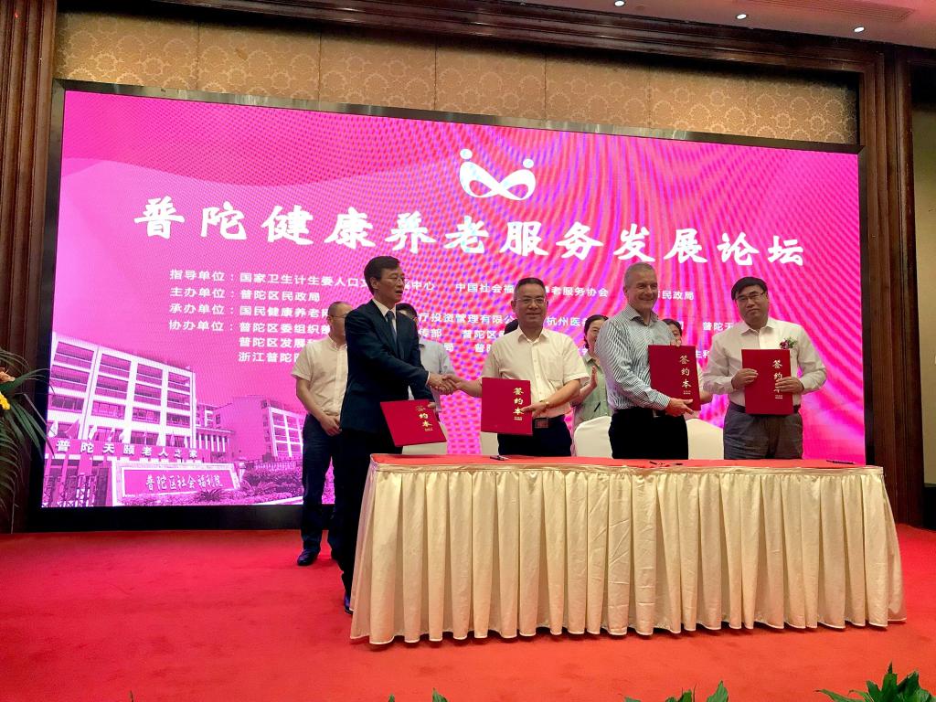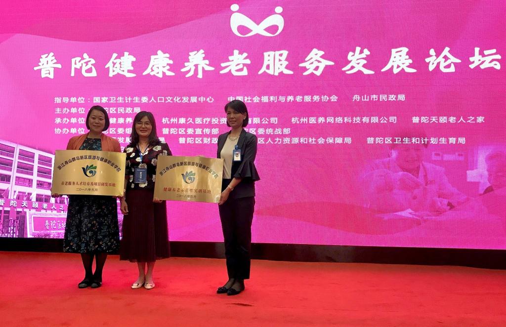 2018年6月11日,在普陀健康养老服务发展论坛上,我校与杭州康久医疗投资管理有限公司成功举行了校企合作签约暨授牌仪式。原浙江省政协副主席陈艳华,国家卫计委人口文化发展中心主任奉雯,中国社会组织促进副会长梁星心,中国社会福利与养老服务协会副会长朱于山,荷兰博组客养老护理集团亚洲区董事长司徒文,国民健康养老网执行总编朱惠民,康久医疗投资管理有限公司董事长耿海波和普陀区委区政府、市民政局主要领导,我院院长郑能波、健康分院院长竺静出席论坛或相关活动。