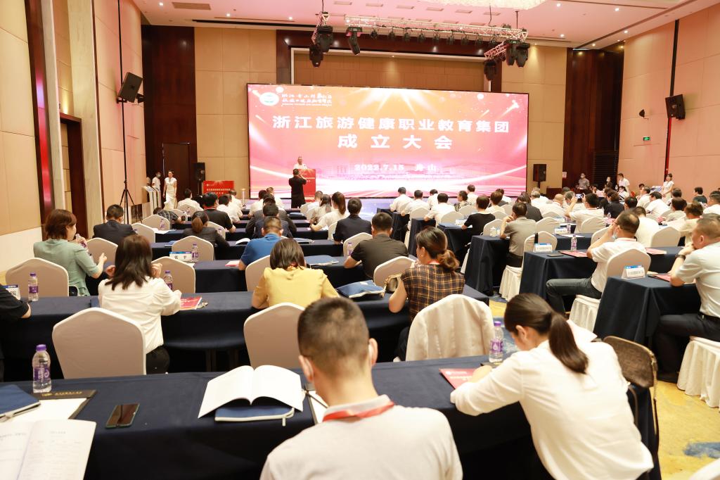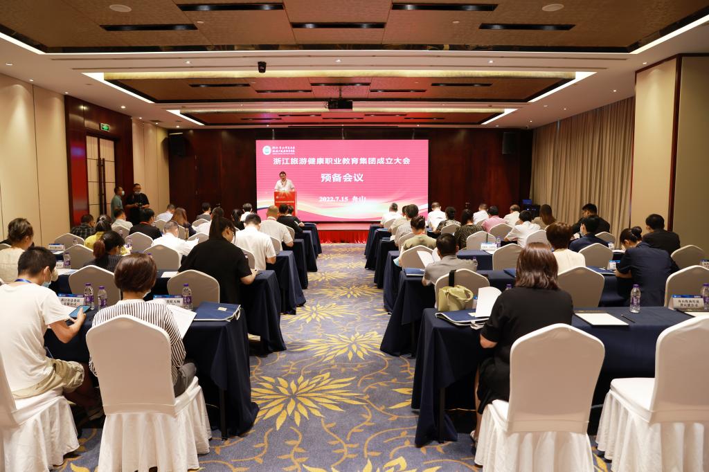 2022 年 7 月 15 日,浙江旅游健康职业教育集团成立大会在舟山海中洲国际大酒店隆重举行。舟山市政府副秘书长厉仁军,浙江省教育厅职业教育与成人教育处二级调研员祝鸿平,省文化和旅游厅科技与教育处副处长赖宋平,世界中医药学会联合会中医健康管理专业委员会副会长、浙江中医药大学党委副书记张光霁,舟山市教育局党委书记、局长陈海波,教育部示范职业教育集团、浙江旅游职业教育集团代表、浙江旅游职业学院副校长王忠林,舟山市卫生健康委员会副主任金秀国,市民政局四级调研员赵金峰,市文化和广电旅游体育局四级调研员刘君英等省市相关部门、职业院校、企事业单位、行业协会的领导和代表,以及学校党委书记姚奇富等领导班子成员出席成立大会。校长郑能波主持成立大会,副校长孔志华主持预备会议。全体中层干部参加成立大会。