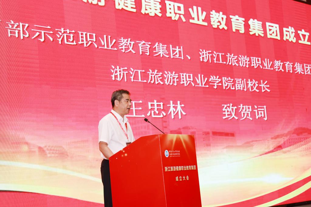 教育部示范职业教育集团、浙江旅游职业教育集团代表,浙江旅游职业学院副校长王忠林代表兄弟教育集团致贺词。王忠林表示,浙江旅游职业教育集团与浙江旅游健康职业教育集团将携手同行、精诚合作,讲信修睦、守望相助,坚守育人初心,不负时代使命,探索产教融合育人新增长极,以“浙江精神”为文化和旅游业发展注入不竭动力。