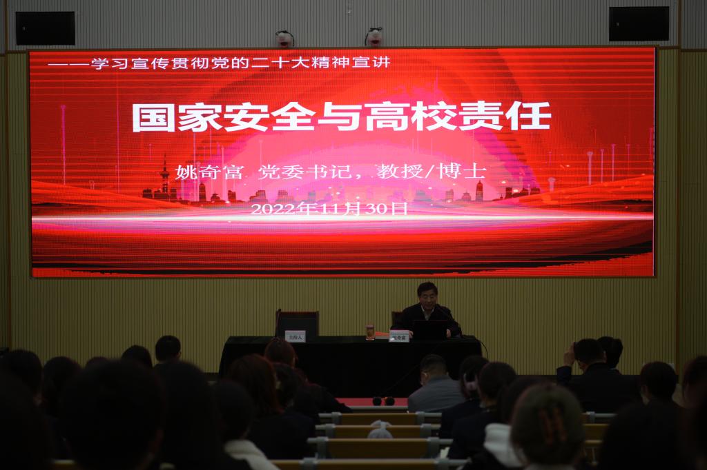 姚书记从“学习领会党的二十大报告”“国家安全”“高校责任”三部分,与师生交流党的二十大精神的学习体会。他表示,党的二十大是在全党全国各族人民迈上全面建设社会主义现代化国家新征程、向第二个百年奋斗目标进军的关键时刻召开的一次十分重要的大会。学习好、宣传好、贯彻好党的二十大精神是当前首要政治任务,全校上下要忠诚拥护“两个确立”,坚决做到“两个维护”,切实把思想和行动统一到党的二十大精神上来。