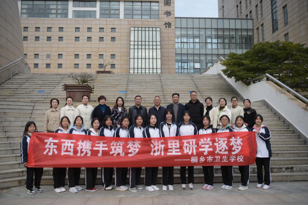 为落实中高职贯通培养,推进两校高质量发展,3月3日下午,桐乡市卫生学校校长屠建根、党委副书记杨林峰、党委委员韩丽雅及师生一行21人到访我校参观交流。校长郑能波、教务处处长邬玮玮、健康学院负责人及相关人员进行了接待。