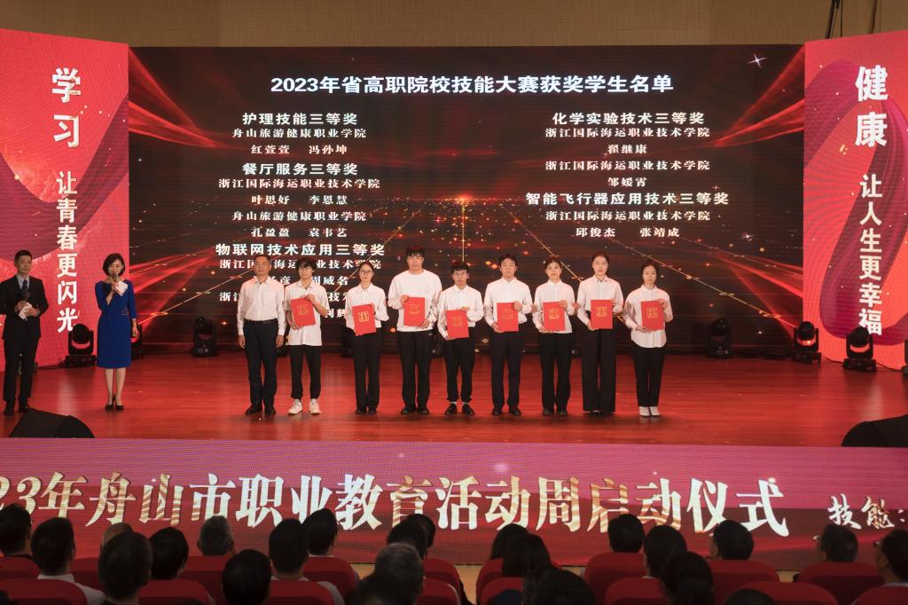 2023年5月16日上午,2023年舟山市职业教育活动周启动仪式在我校隆重举行。今年的主题仍是“技能:让生活更美好”。副市长洪碧出席会议并讲话,市政府副秘书长厉仁军,市教育局党委书记、局长陈海波,浙江国际海运职业技术学院党委书记苏为泽,我校党委书记姚奇富等领导出席仪式,校长郑能波致欢迎辞。市职业教育工作联席会议成员单位分管领导、相关处室负责人,县(区)教育局分管领导、业务处室负责人,舟山开放大学、全市各职业院校负责人,部分初高中学校负责人,部分行业企业、教师、学生代表共450多人参加仪式。