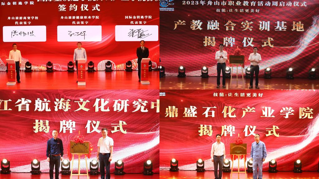 启动仪式上,进行了七项校企合作项目的签约、揭牌仪式。其中,学校党委书记姚奇富与定海区卫健局领导,为我校与定海区卫生健康局合作共建的“海岛未来社区健康学院”隆重揭牌。我校还与舟山旅游商贸学校、国际金钥匙学院共同签订了国际金钥匙学院舟山产业学院协议。为进一步推动产教融合、校企合作打下坚实基础。