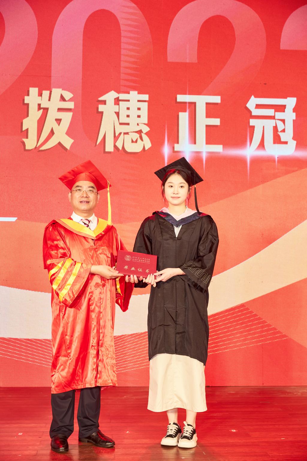 典礼最后,校长郑能波为毕业生代表进行拨穗、颁发毕业证书,并合影留念。