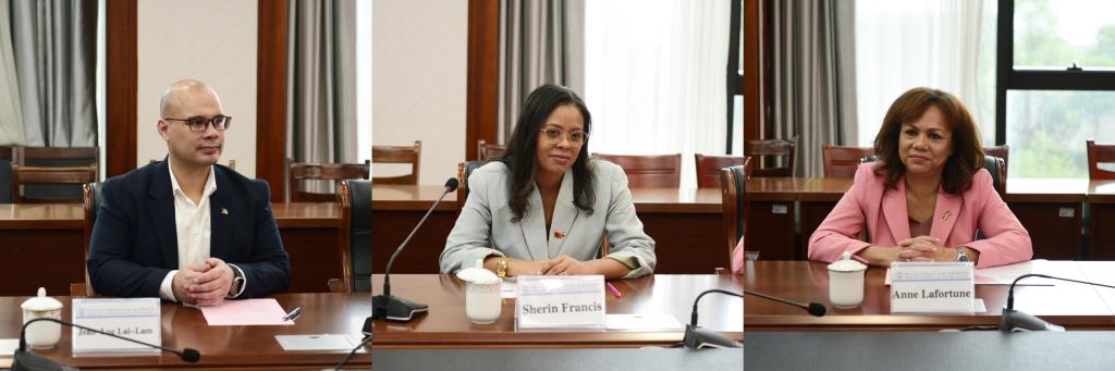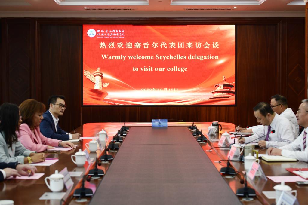 在由浙江省人民政府主办,浙江省文化和旅游厅、舟山市人民政府承办的2023国际海岛旅游大会举办之际,2023年10月12日上午,塞舌尔外交和旅游部旅游首席秘书谢林·弗朗西斯女士为团长的塞舌尔代表团一行四人来访我校,校长郑能波和学校教务处、外事办、旅游学院、健康学院负责人会见来宾。塞舌尔驻华大使安妮·拉福蒂纳女士、塞舌尔旅游局区域总监黎仁杰先生随行。