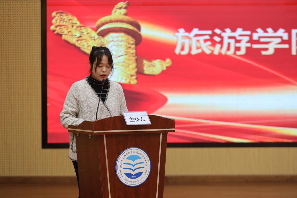 学生代表表演诗歌朗诵《青春中国》献礼大会,展现了舟旅健学子对祖国的热爱、对青年的赞颂。