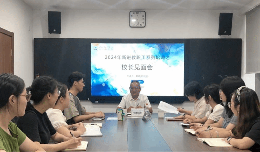 2024年9月10日教师节上午,学校教师教学发展中心于慎思楼一楼研讨室举行2024年新进教职工校长见面会。参会人员包括校长郑能波、学校人事处唐洁君、学校教师教学发展中心陈勇以及严晨瑜在内的八名新进教职工。