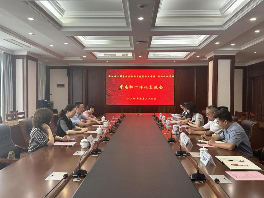 为深入推进中高职一体化办学的水平,提高专业长学制培养的衔接性,2024年9月26日,绍兴护士学校俞莉校长一行到我校,就中高职一体化合作办学等相关事宜进行座谈交流。校长郑能波、副校长黄承,以及教务处、健康学院相关人员参加了会议。