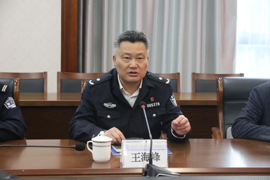 郑能波校长对王海峰一行的到来表示欢迎。他表示,学校高度重视校园安全工作,将“平安护校”列为学校六大发展战略之基,深入推进“人防、物防、技防、心防”,多措并举,校园安全工作形势整体积极向好。孔志华副校长从做好学生矛盾化解、召开主题班会、高度关注学生心理健康、有效开展五类生管理、定期研判学生思想动态、筑牢校园安全防线、携手共建“校警驿站”等七个方面入手,介绍了学校在维护安全稳定工作方面的具体做法和成效。双方就下一步安全工作如何互动联动开展就行了深入研讨。