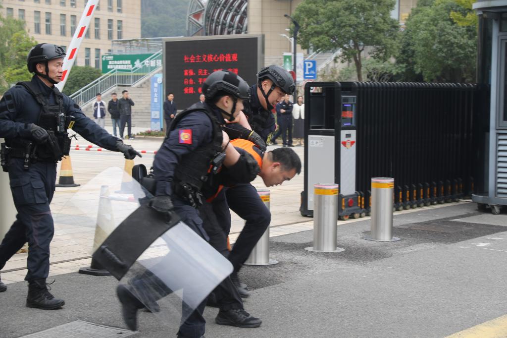 为营造安全稳定的校园环境,进一步提升校园安保队伍应对突发暴力事件的处置能力,2024年11月22日上午,学校联合普陀山公安分局开展校园防恐防爆应急演练。校长郑能波,普朱管委会副主任、普陀山公安分局局长赵盛斌观摩演练并讲话,副校长黄承和警校双方相关人员观摩或参与演练。