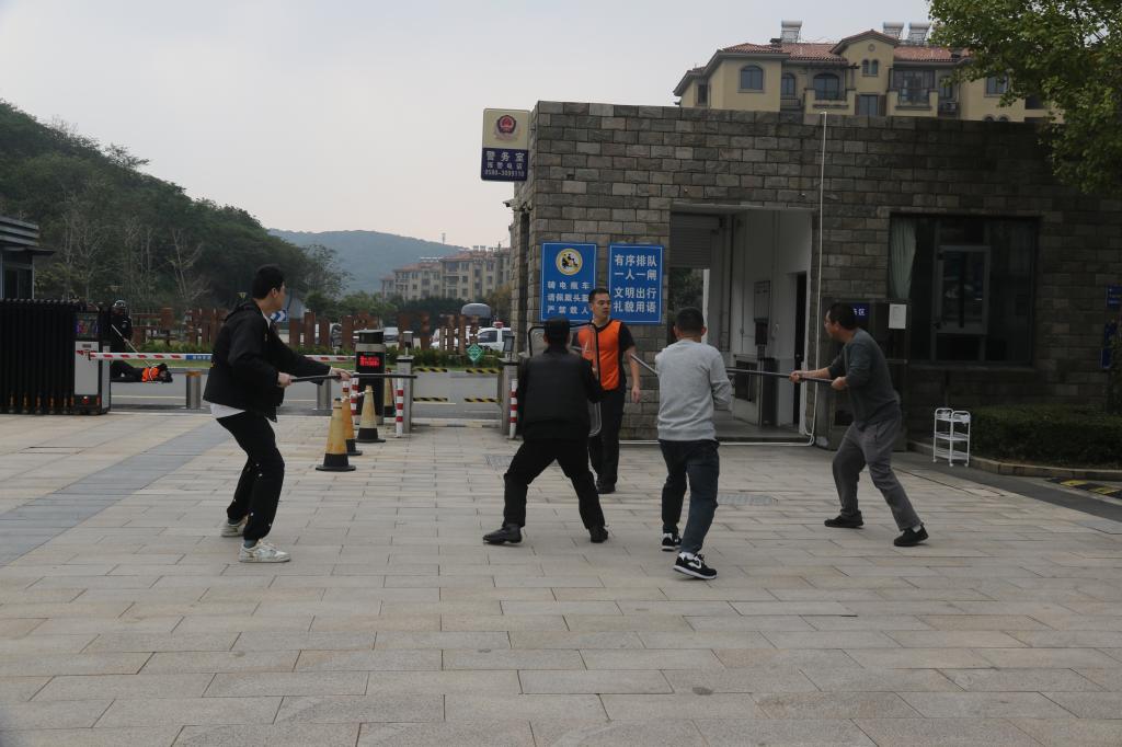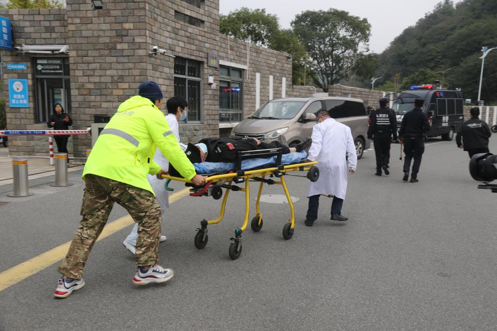 演练模拟情节为多名“暴徒”手持刀具,伺机强行闯入校园,对师生发起袭击,学校立刻启动应急预案,门卫保安人员当即触发一键报警,呼叫应急小队,并拿起钢叉、盾牌与“歹徒”展开周旋。接警后,普陀山公安分局情指中心第一时间启动“135”快反机制,快速指令朱家尖派出所、交警、巡特警等警力到校处置,同步联动120前往现场救援,成功将“暴徒”制服并带离现场。整个演练过程,各组分工明确、行动迅速、配合默契、处置得当,达到了预期效果。