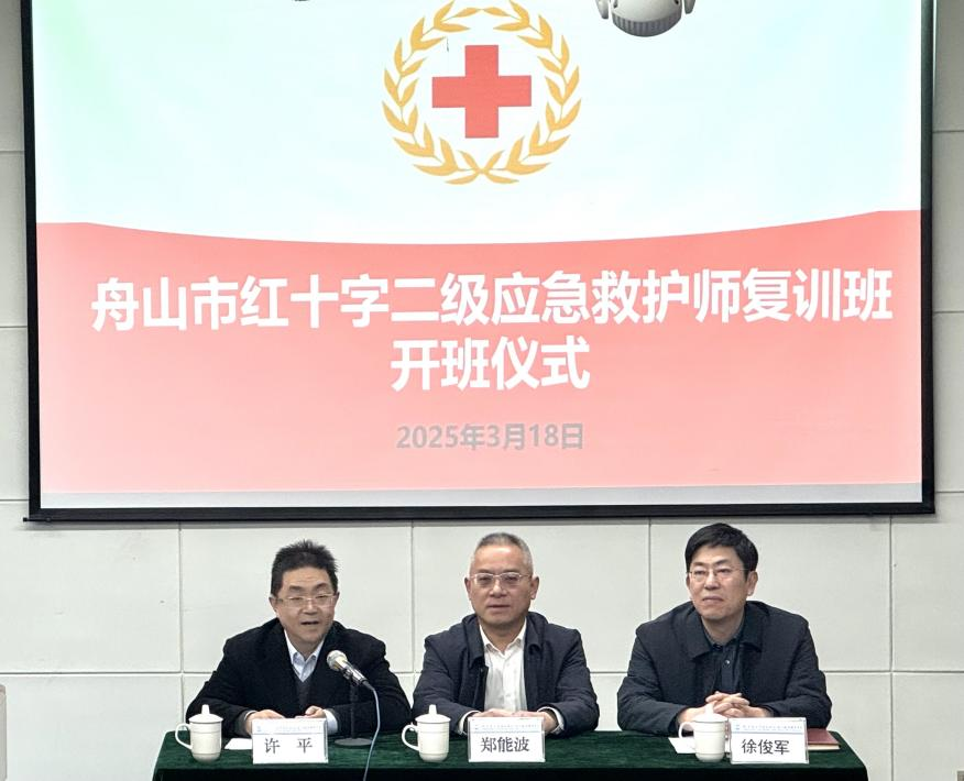 2025年3月18日,由舟山市红十字会主办、舟山市红十字学院协办的2025年舟山市红十字二级应急救护师复训班在我校开班。舟山市红十字会党组书记、常务副会长徐俊军出席仪式并讲话,校长郑能波,市红十字会现场应急救护培训指导中心主任蒋朝进等领导出席开班仪式。市红十字会副会长许平主持开班仪式。