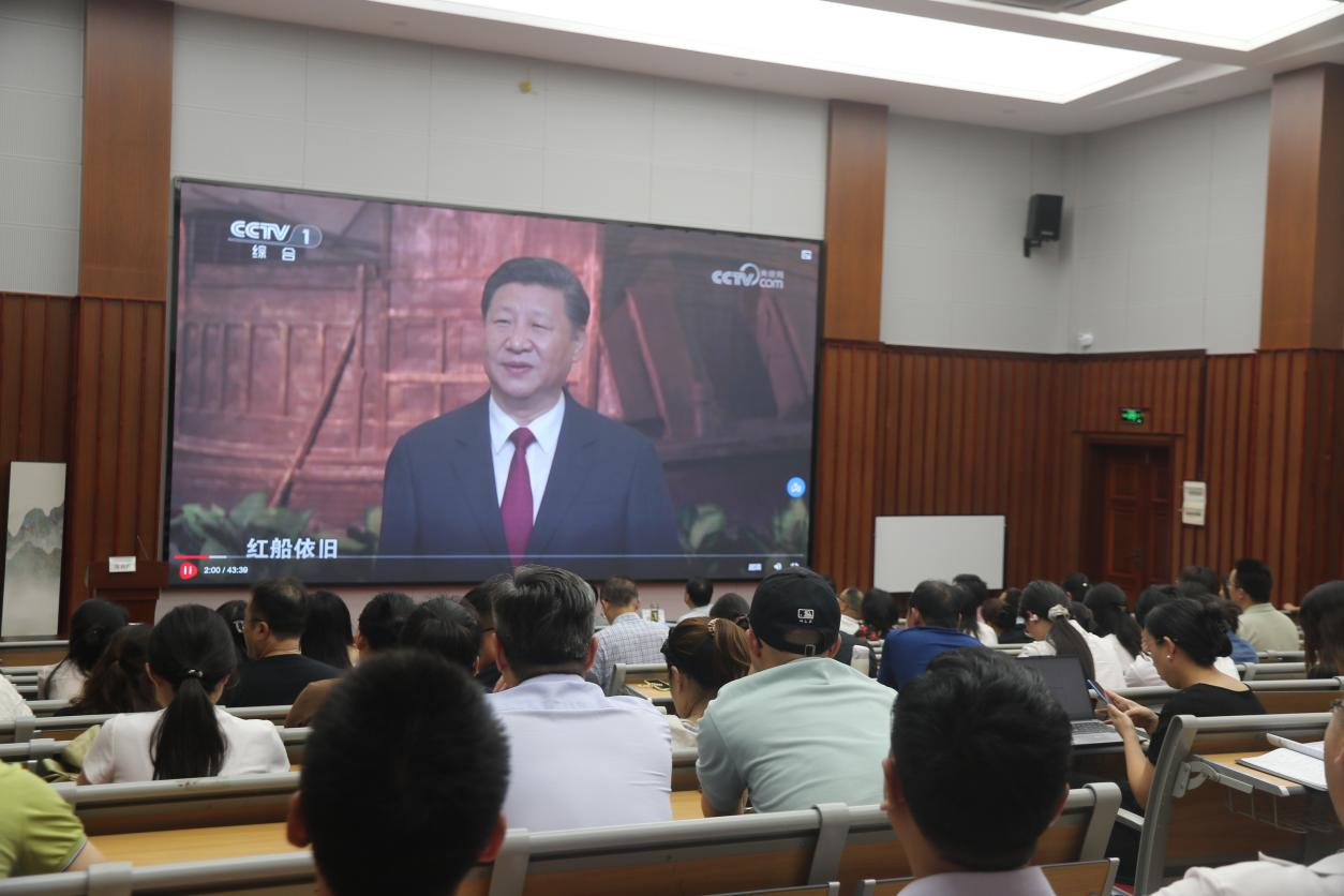 第二阶段,全体与会教职工集中观看了大型电视专题片《文化的力量——习近平文化思想在浙江的溯源与实践》第一至第四集。该片系统梳理和生动展现了习近平文化思想的实践源头与丰富内涵,特别是其在浙江的萌发、发展与深远影响。通过大量真实影像与典型案例,影片深刻阐释了“八项工程”的战略部署与文化大省建设的探索历程,为全体教职工理解习近平文化思想的理论逻辑、历史逻辑和实践逻辑提供了鲜活教材。观看过程中,全体与会教职工全神贯注,深刻感悟思想伟力,汲取文化力量。