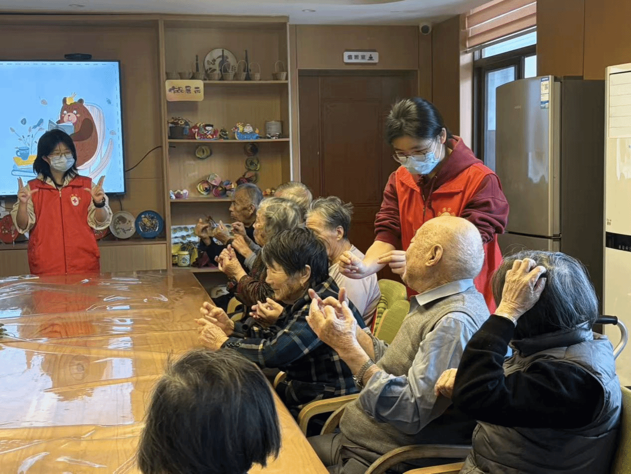 除了理论讲解,实践环节更是精彩纷呈。在手工制作活动中,学生们耐心指导老人们辨识草药、分装材料,共同制作安神香囊等小物件。老人们指尖翻飞,神情专注,与年轻学子们互动频繁,现场气氛温馨融洽。手指操教学课上,学生们化身“健康教练”,站在屏幕前,一边演示着灵活的手部动作,一边讲解每个动作对促进血液循环、锻炼大脑功能的益处。老人们跟着节奏认真模仿,脸上洋溢着孩童般的笑容。这些互动性强、趣味性高的活动,不仅锻炼了老人们的手脑协调能力,更丰富了他们的精神文化生活,让欢声笑语充满活动室。
