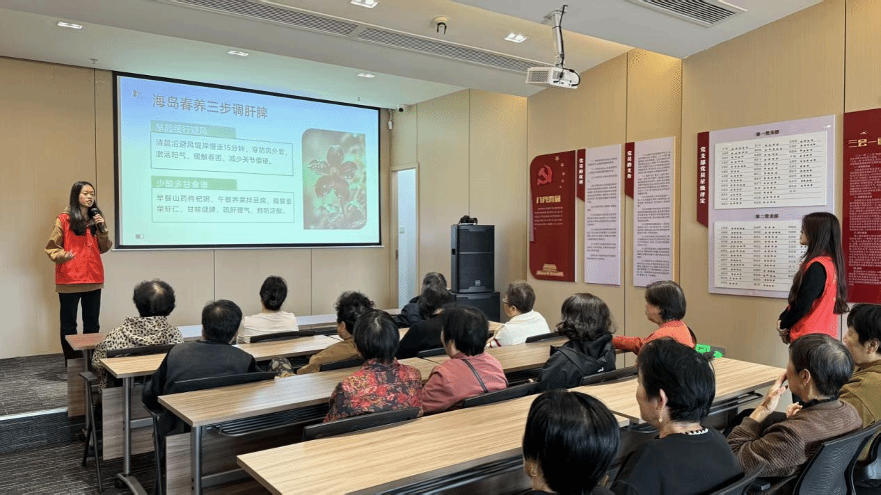 实践周期间,同学们针对海岛春季气候特点及中老年人常见健康问题,开设了多场主题鲜明的养生知识讲座。在一场题为“海岛春养三步调肝脾”的讲座中,身着红色马甲的学生讲师们,借助精心制作的PPT,用通俗易懂的语言,为在场的老年居民详细讲解了“早起缓行避风”、“少酸多甘食谱”等贴合海岛生活的春季调养要点。老人们聚精会神,时而点头表示认同。背景墙上醒目的“党员义务”等宣传栏,也映衬出此次活动党建引领、服务基层的鲜明底色。这些讲座不仅传播了科学的健康观念,更提升了居民们的自我保健意识,为海岛老人的健康生活注入专业动能。