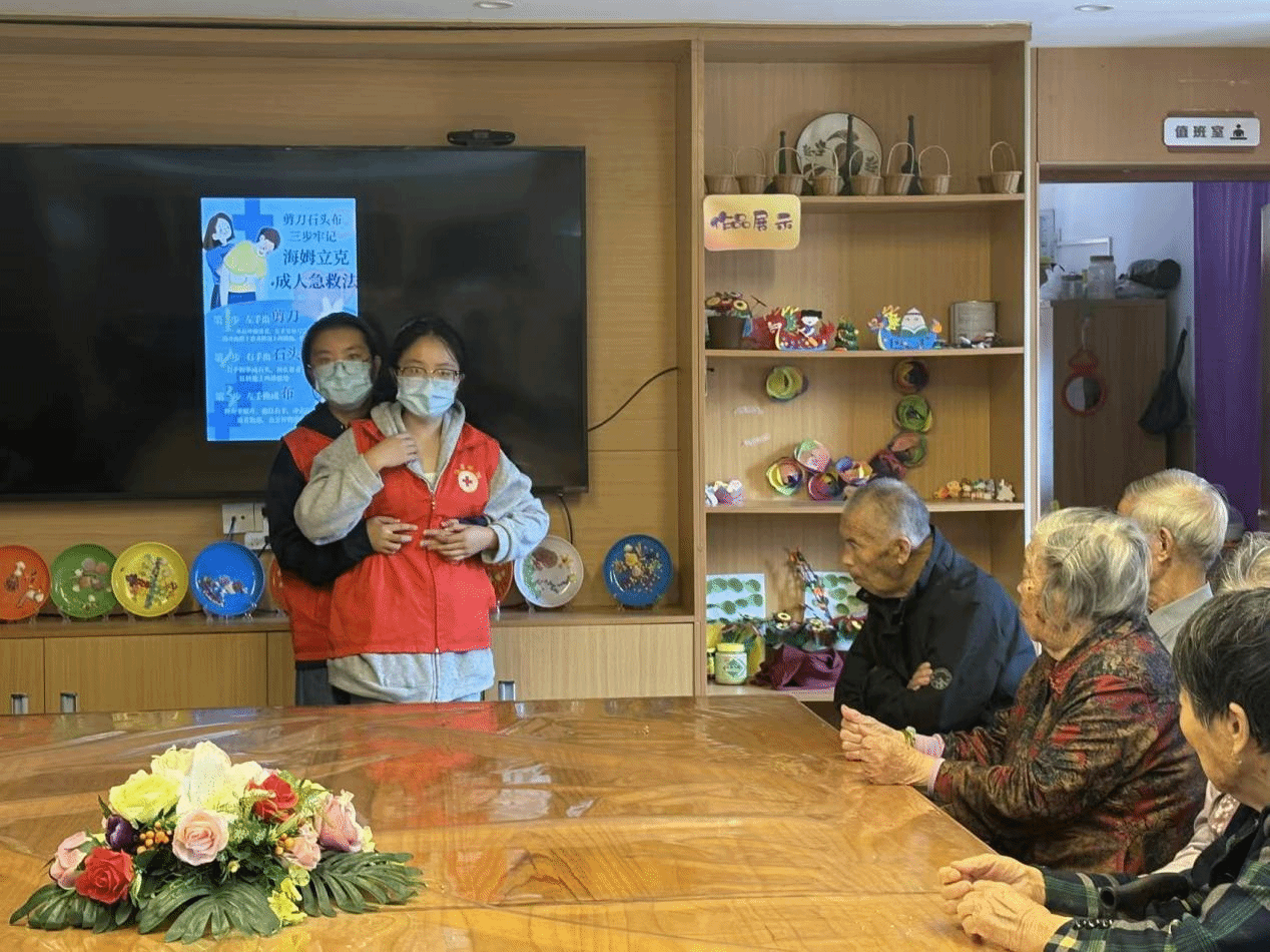 保障生命安全是健康服务的重要一环。学生们特别为海岛老人带来了实用的急救知识培训。在“海姆立克急救法”演示环节,两位同学相互配合,清晰展示了成人发生气道异物梗阻时的标准施救步骤。电视屏幕上同步播放着操作要点,便于老人们理解和记忆。台下,老人们看得格外认真,不时低声交流。将关键的急救技能带到老人身边,增强了他们应对突发状况的能力,为海岛社区的平安建设增添了一道防线。