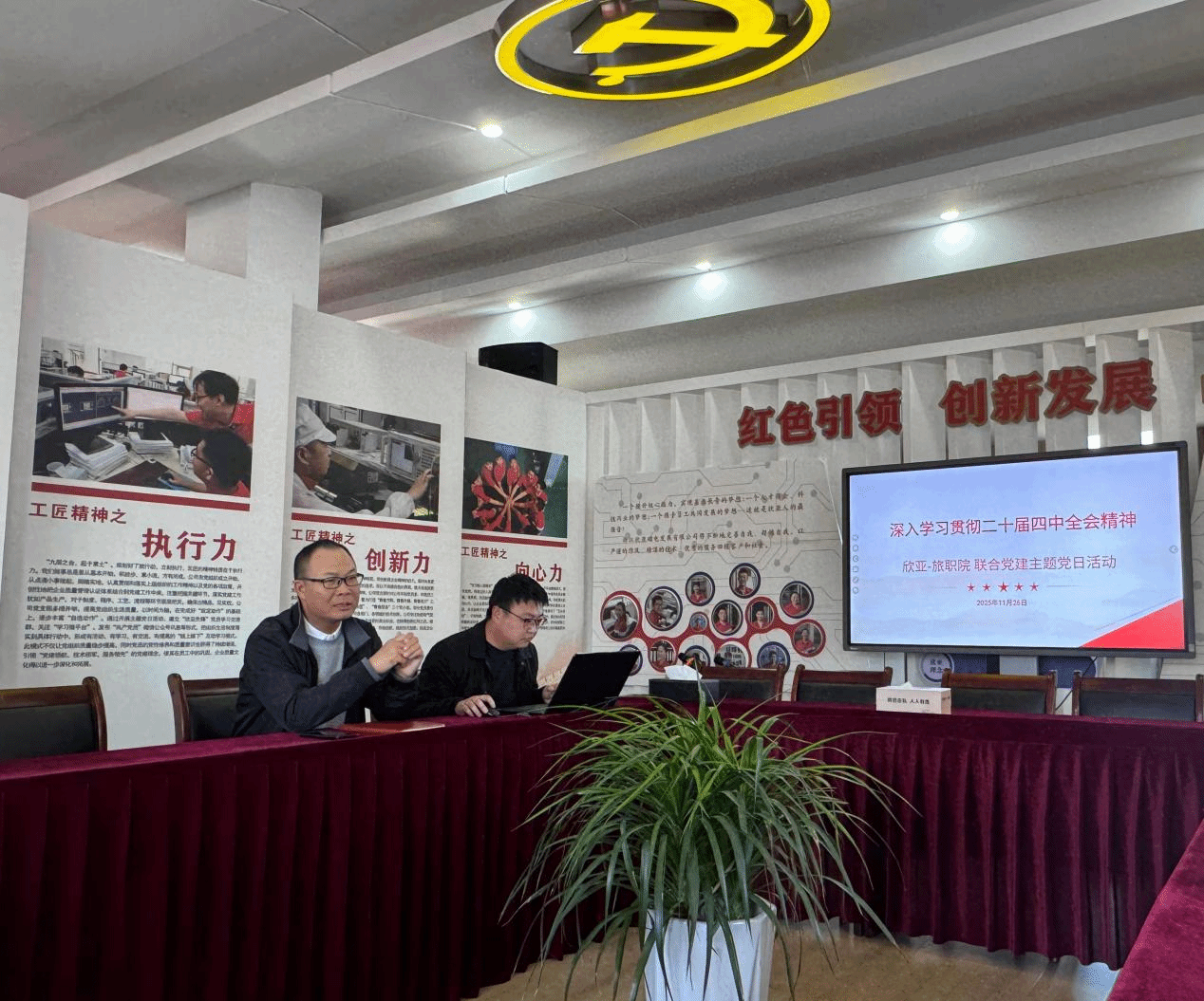2025年11月26日,我校思政教师董鸿飞赴浙江欣亚磁电发展有限公司,面向企业党员与我校机关党支部党员教师,开展党的二十届四中全会精神专题宣讲。宣讲围绕“贯彻落实党的二十届四中全会精神,谱写‘十五五’时期中国式现代化新篇章”主题,深入解读了国内外发展形势、中国式现代化的核心任务,以及“十五五”规划的主要目标与亮点特点,重点阐述了加快发展新质生产力、建设现代化产业体系、推动高水平科技自立自强等内容。