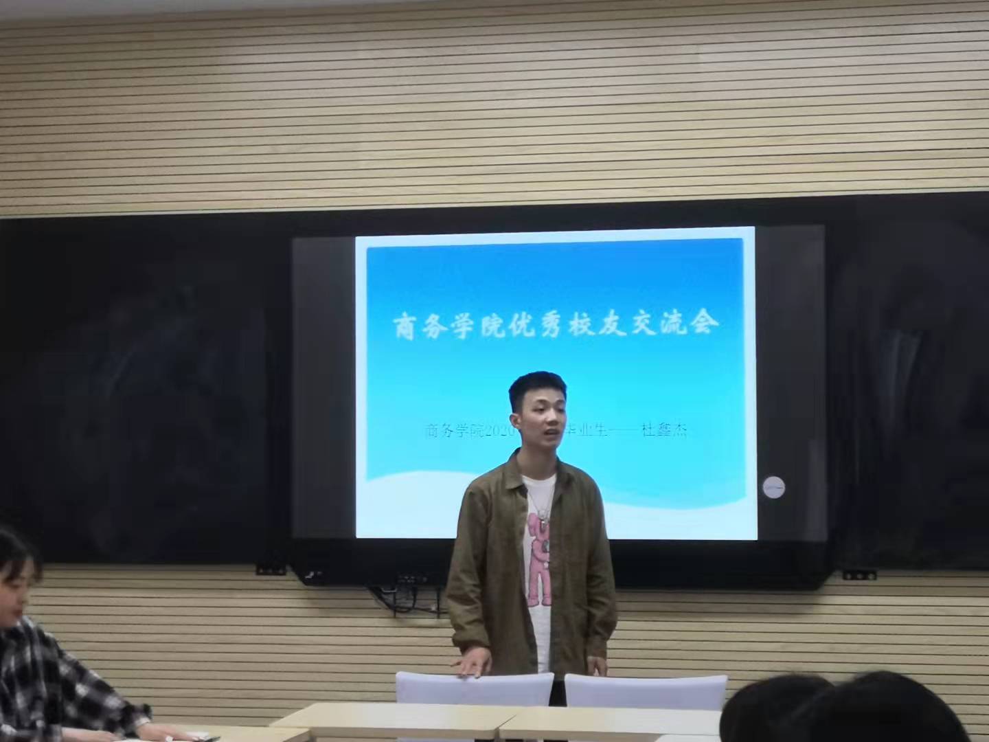 本次返校交流活动邀请了商务学院2020届毕业生、浙江省优秀毕业生、国家奖学金获得者,现就读于宁波财经学院的校友杜鑫杰。交流会上,杜鑫杰结合亲身经历,从大学生活、目标规划、择企就业、如何进行升学备考等四个方面进行与大家进行交流,为即将进入实习和就业的同学们解答当下的困惑,更好地明确自己的职业规划以及明确努力的方向。交流会上,杜鑫杰希望大家摆正心态,努力学习,做好规划,描绘属于自己的美好青春。