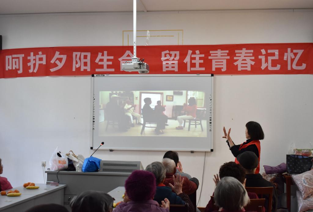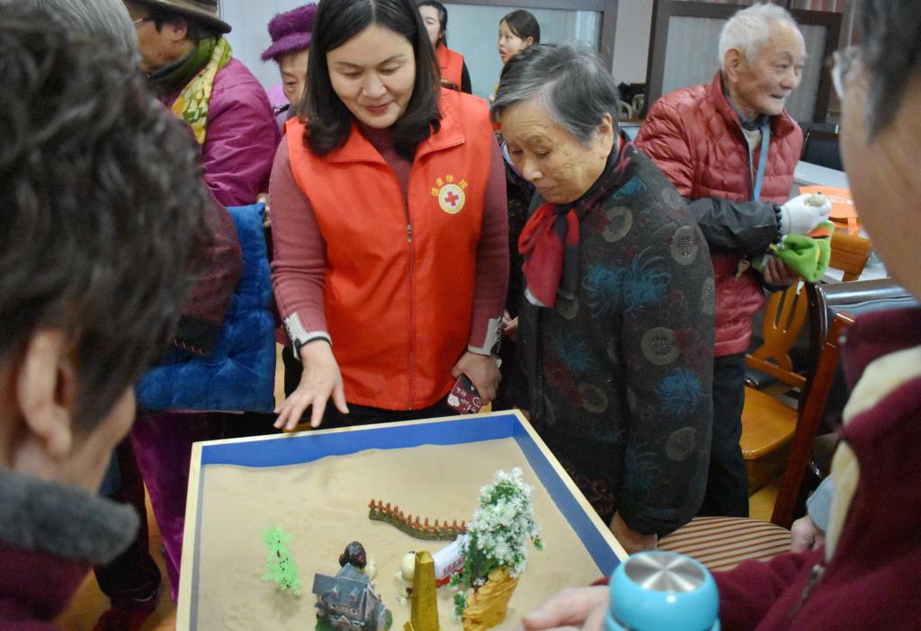 下午12:30一行人到达目的地,开始布置场地,准备益智游戏的道具和设备。14:00老人们结束午睡,陆续入座参加活动。第一个游戏是由丁优娜老师给老人家们准备的手指操游戏,该游戏意在消除疲劳,缓解情绪,在活动手指的同时促进大脑的功能。不一会儿老人们的一双眼睛就眯成了弯弯的月牙,苍老的嘴角露出一丝慈祥,甚是欢喜;第二个游戏是由夏文娜老师准备的音乐游戏“猜歌名”老人家们对这个游戏十分感兴趣,积极举手答题、合唱;第三个游戏是芮秋琴老师准备的沙盘游戏—心理游戏,沙游具有疗愈的作用,能够抚慰人的心灵,同时,沙盘体验又像一场游戏,可以暂时忘却不愉快;最后是注意力游戏,通过此游戏提高老人们动作的协调性和灵敏性。