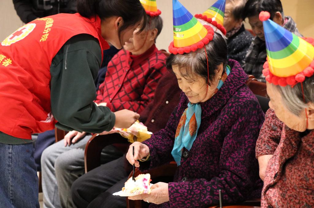 盛世年华风光好,人寿年丰喜事多。在主持人的报幕声中活动拉开序幕,随随即耳熟能详的《生日快乐》歌曲响起,志愿者们将祝寿蛋糕缓缓推入,大家同唱生日歌,寿星们双手合十许愿、切蛋糕,品尝蛋糕。现场欢笑声、祝福声不断。寿星们围坐一起,手捧着同学们亲手制作的爱心贺卡,一声声生日祝福让老人们陶醉在暖冬中,与温暖有约,与阳光相伴,与真情相依。看着老人们开心的笑容,志愿者们感到十分欣慰。