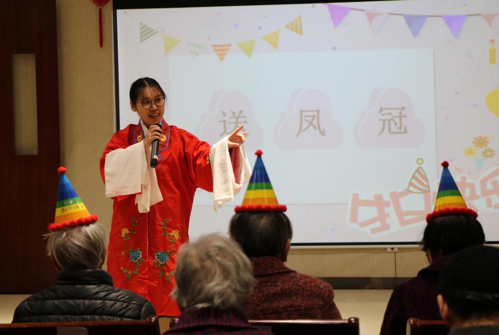 接下来的节目让人目不转睛,独唱《月半小夜曲》让人身临其境,带来无限遐想;两位同学用舟山本地话向现场的寿星们送上祝福;越剧《送凤冠》生动表现了江南独特传统文化,现场有爷爷奶奶跟着表演者一起哼唱;笛子独奏《南泥湾》和《茉莉花》将中国传统乐器发挥得淋漓尽致;满地散香,泛黄岁月的痕迹,多才多艺的同学们带来的弹唱节目《菊花台》让人忘我;最后由结对志愿者带来小合唱《好日子》,向大家传递了对美好生活的憧憬和向往。