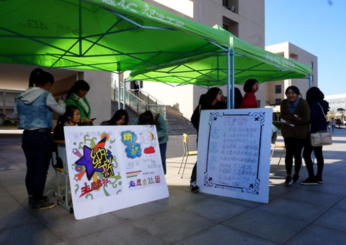 2014年11月26日,由团委主办、校学生会协办的我校学生社团招新工作在行政楼前火热进行。