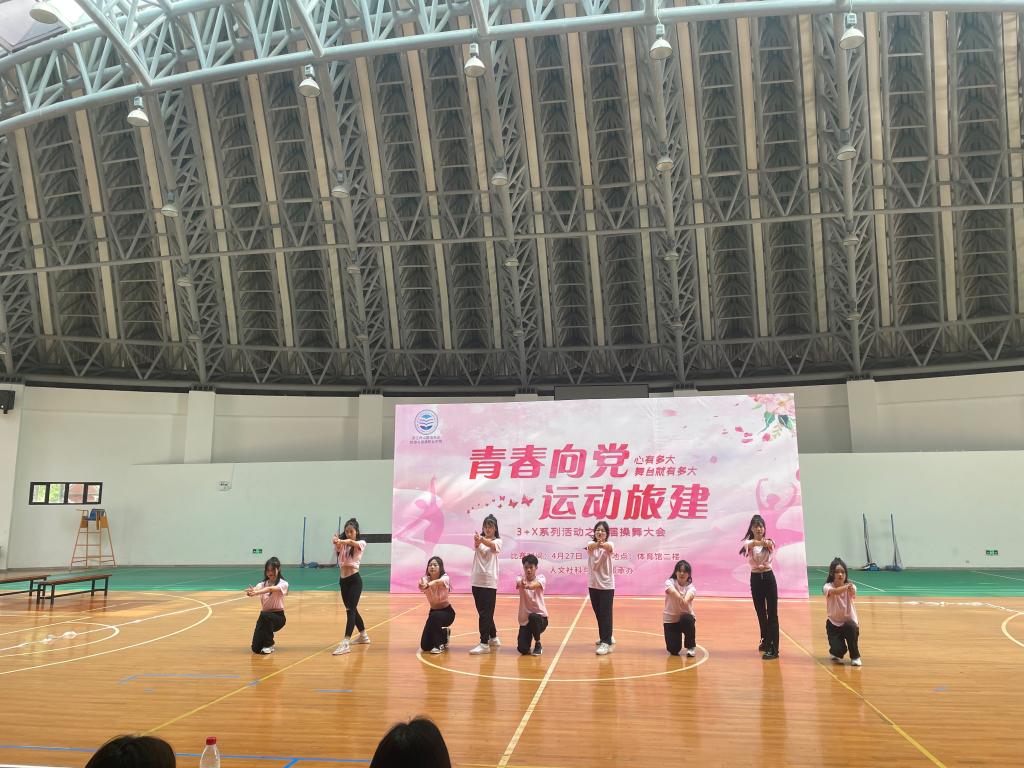 心有多大,舞台就有多大。为全面贯彻中共中央办公厅、国务院办公厅印发的《关于全面加强和改进新时代学校体育工作的意见》,备战选材大学生操舞大赛,丰富学生课外活动,拓宽学生展示自我的平台,促进学生全面发展,我校于2022年4月27日成功举办了“青春向党·运动旅健”3+X系列活动之首届操舞比赛。
