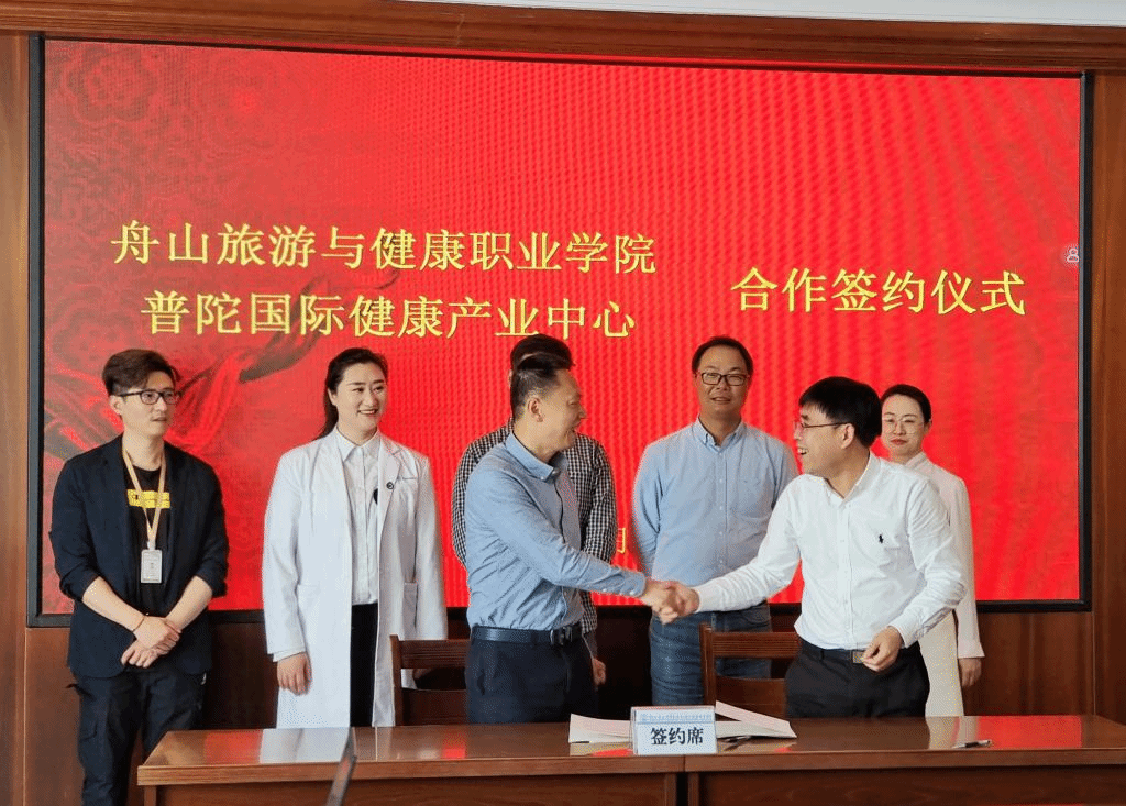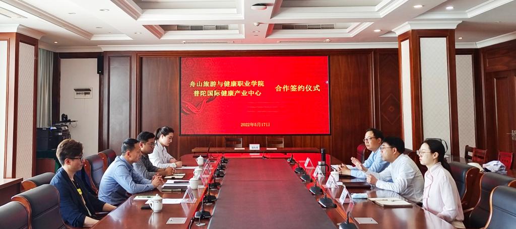 5月17日上午,我校与普陀国际健康产业中心签订合作框架协议,普陀区大健康产业平台工作组负责人、普陀区卫健局副局长汪志华、综合部部长叶家辉,浙江京恩医疗科技有限公司行政总监蒋凤迪,舟山明峰体检中心总经理助理杨鸥,我校党委委员、副校长张朝阳,健康学院党总支书记胡炳波,副书记王珊珊出席签约仪式。