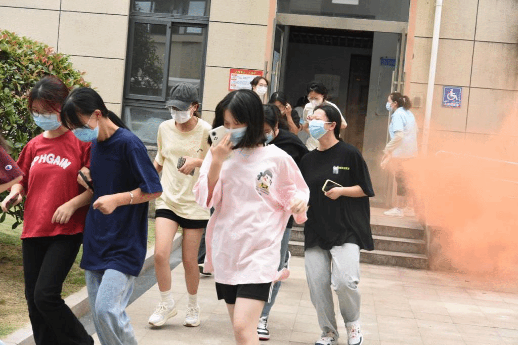 下午一点整,一阵刺耳的火警警报声拉开了此次活动的序幕,在烟幕弹的作用下各幢宿舍楼内迅速充满浓烟,同学们在辅导员和宿管员的引导下,有条不紊地沿着指定楼梯口快速前进,有序撤离到学校田径场。