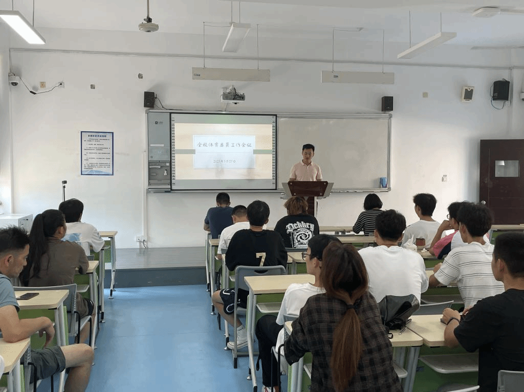 会上,董舟维老师对学校第九届田径运动会报名工作做详细的介绍,鼓励各班级积极参加学校运动会;王志巍老师对学生体质健康测试工作进行了详细的介绍,创建学生体侧群,指导学生更好的学校的完成学校体质健康测试工作;章天军老师讲解了体育保健班的申请流程和要求,让各班体育委员明晰体育保健课程,并准确在班级内传达;孙浩东老师鼓励各班体育委员积极宣传学校体育运动队,让有体育技能特长的同学有发挥优势的平台;郑将栋老师带领各班体育委员学习了《舟山旅游与健康学院阳光长跑管理办法》《舟山旅游与健康学院第九届田径运动会竞赛规程》两份文件,对学生的疑问一一进行解答,并对学校体育工作进行了总体的安排与要求。
