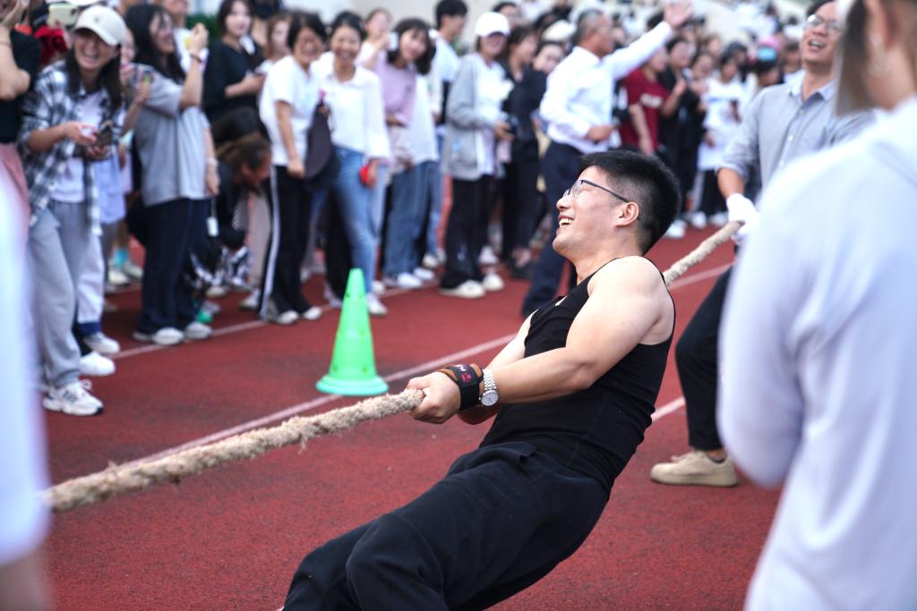 其中拔河比赛充满了激情和张力,参赛队员们紧握长绳,聚焦麻绳中点,齐心协力,展现出良好的精神风貌。观赛的师生自发组成啦啦队为队员们加油鼓劲,激烈的比赛氛围将整个活动推向高潮!