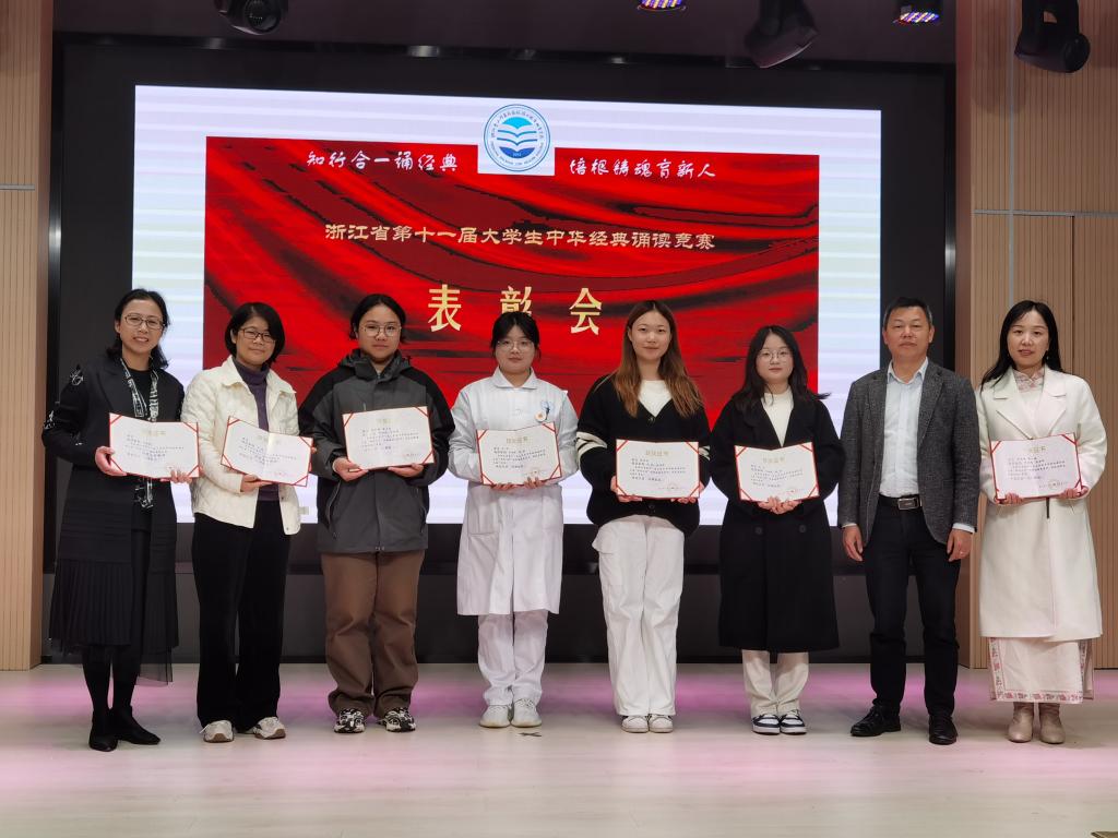 浙江省第十一届大学生中华经典诵读竞赛获奖证书于近日寄到,我校再次实现突破,获个人组一等奖2项、二等奖1项,综合组二等奖1项、三等奖1项,两位教师获省“优秀指导教师”称号。