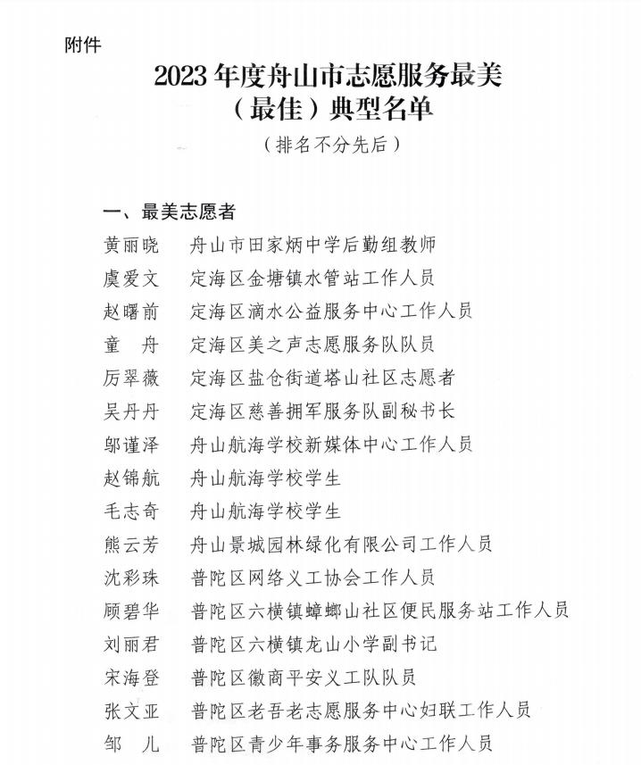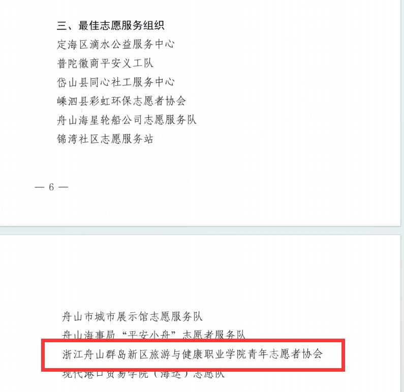 近日,2023年度舟山市志愿服务最美(最佳)典型评选活动出炉。我校青年志愿者协会获评“最佳志愿服务组织”,旅游学院张雅彬同学获评“最美志愿者”。
