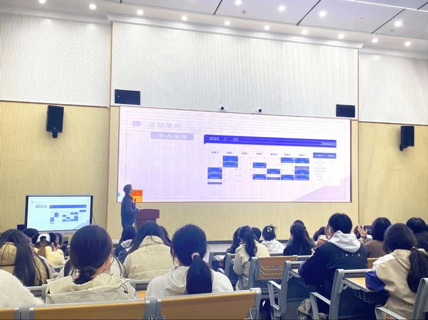 沈家迪老师着重强调新媒体定位与选题的关键作用,指出校园新媒体应以校园生活为核心,善用大数据分析、抽奖活动及学生事迹分享等手段提升粉丝活跃度。在内容策划与运营方面,他详细拆解选题规划、内容编辑与传播等环节,并结合“浙江海洋大学”官方公众号案例,介绍多种选题方向。