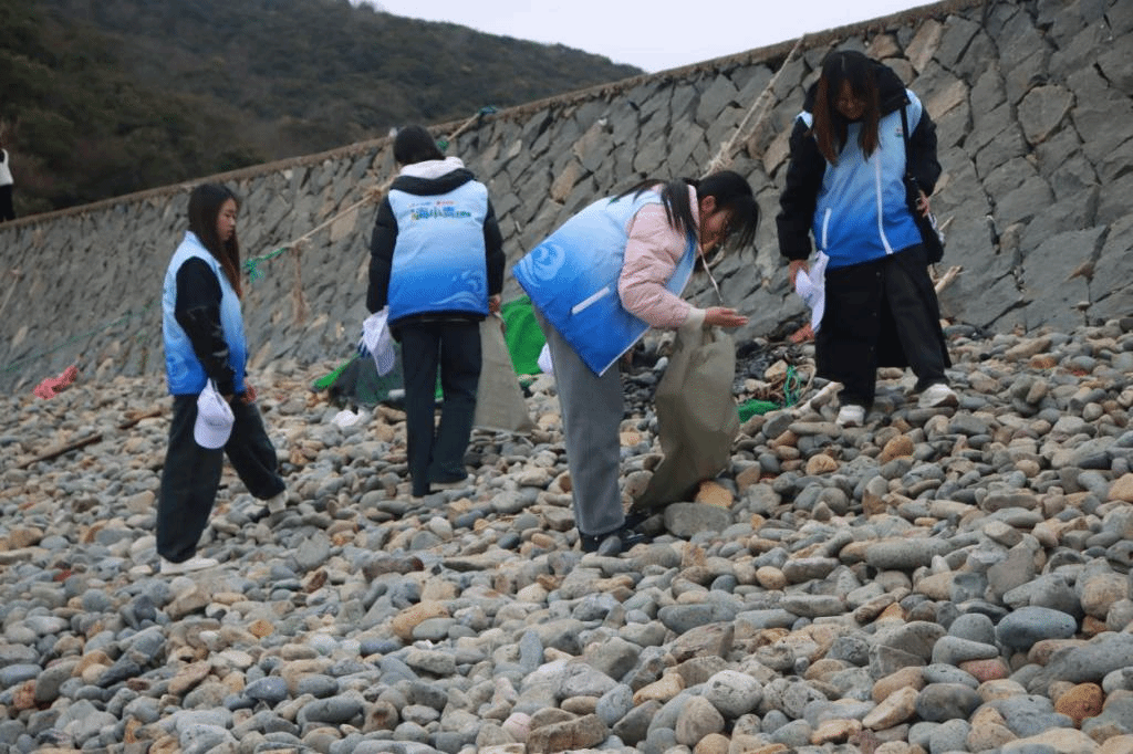在小乌石塘景区,志愿者们手持工具,认真清理景区沙滩上的海洋垃圾,让公共环境更加整洁。