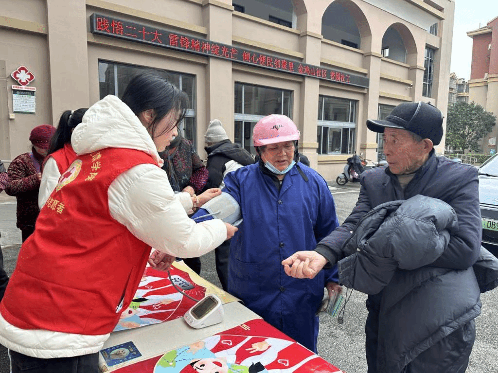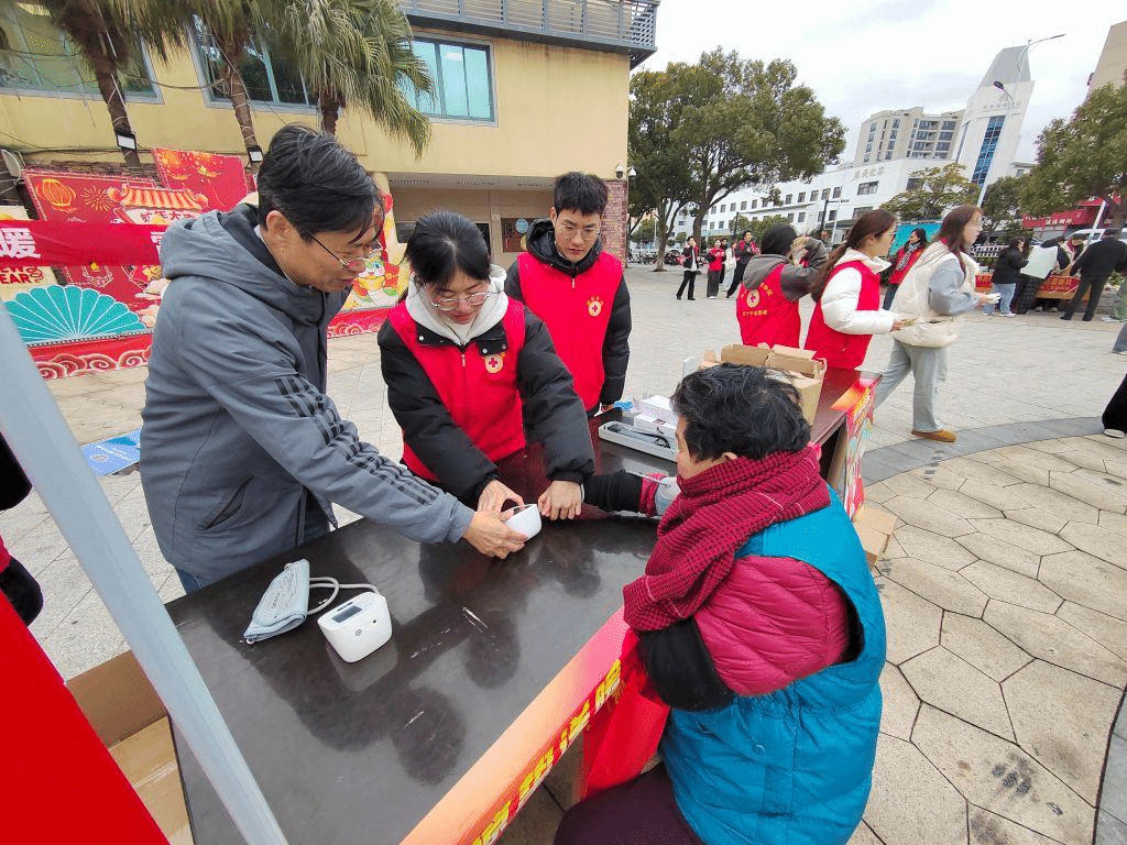 在朱家尖文化广场和金鸡山社区,志愿者们将春季养生知识与传统惊蛰习俗相结合,为当地居民测血压,赠送养生茶包,宣传春季养生知识。