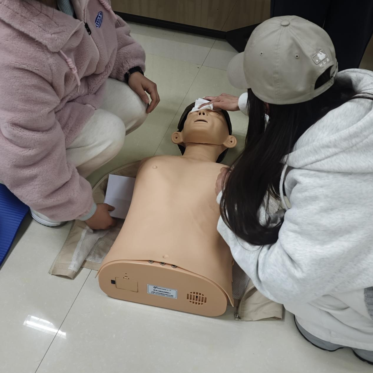 在校园内,志愿者们设立“健康驿站”,为同学们测血压,赠送健康小贴士、养生茶,并开展旅游急救演示,宣传应急救护知识。