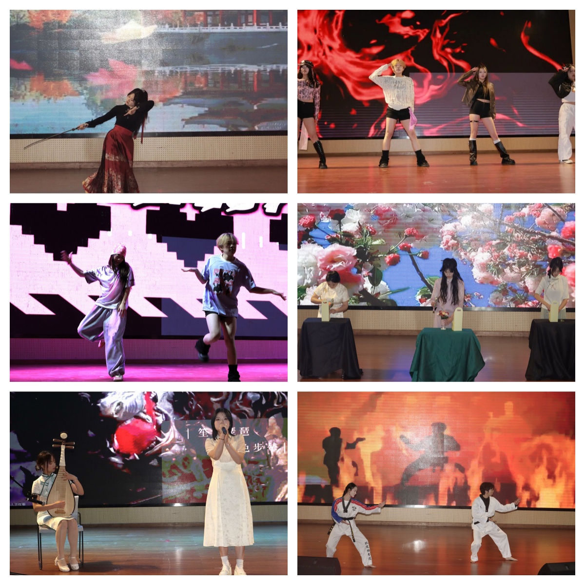晚上6点,随着开场舞《kill this love》的展开,社团特色节目展演正式开始。“星翼筑梦”孤独症服务协会演绎的舞台剧《星星点灯,照亮你我》实现公益与艺术的完美交融;导游队的《剑舞》来势汹汹,一招一式之间如有惊雷,颇具观赏性;茶韵茶艺队行云流水的茶艺表演、旅尚花艺队的花艺快闪,更将东方美学融入舞台,赢得阵阵喝彩。中医养生队的小品《总裁请就诊》以幽默剧情科普养生知识,笑声中蕴含智慧;播音主持队朗诵《月光下的中国》声情并茂,抒写家国情怀;器乐队琵琶弹唱《壁上观》则用婉转旋律勾勒古风画卷,传统与潮流碰撞出独特火花;乐队的一首《普通朋友》和舞蹈队的舞蹈《strategy》将氛围推向高潮,尾声环节,合唱队以《风吹麦浪》轻柔和声为文化节画上诗意句号,寓意青春如麦浪般生生不息。