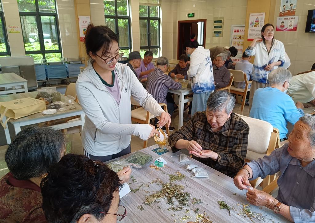 活动现场,张老师与志愿者通过讲解视频,分步骤指导老人制作龙舟挂件,全程一对一耐心协助,帮助老人顺利完成作品,收获满满成就感。在香囊制作环节,志愿者详细介绍各类香料及功效,老人们根据喜好挑选香料,亲手装入香囊,让传统手作承载美好祈愿。此外,端午歌谣传唱将活动推向高潮,老人们一同学唱《过端午》等民谣儿歌,在悠扬歌声中回忆往昔,共话端午情。