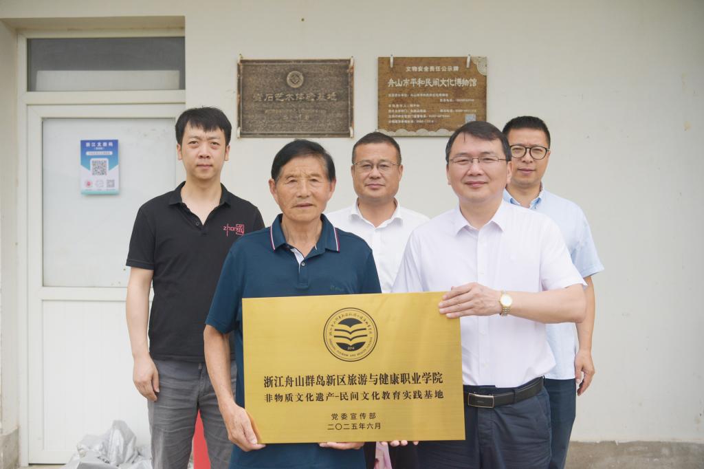 仪式上,孔志华副校长代表学校向鲍平和馆长授予“非物质文化遗产-民间文化教育实践基地”铜牌。他表示:“非遗是中华文明的活态基因,高校肩负文化传承创新使命。此次基地设立,是我校深化‘三全育人’、推动舟山地域文化融入教育教学的重要举措。未来将以基地为纽带,让学生在实践中感知非遗魅力,助力传统文化焕发新生。”