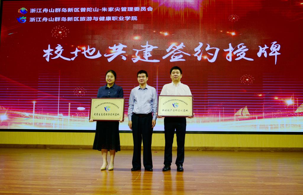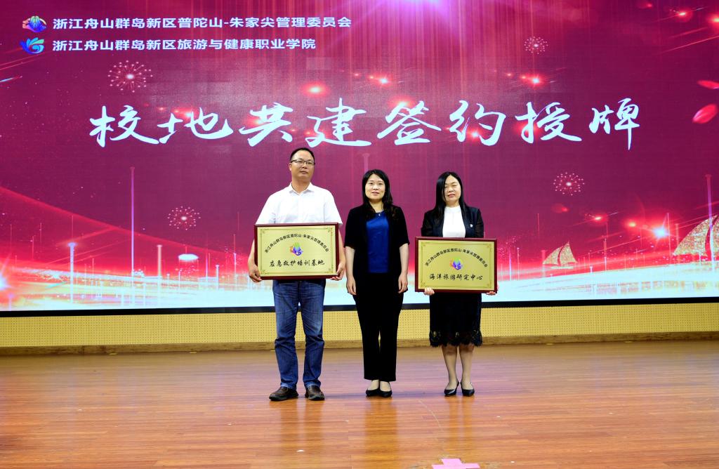签约仪式上,普朱管委会副主任蔡敏波和我校党委委员、副校长李涛,共同签署校地合作协议。随后,双方单位代表分别就“海洋旅游研究中心”“应急救护培训基地”“新媒体产学研实训基地”“大学生志愿服务实践基地”进行了授牌。