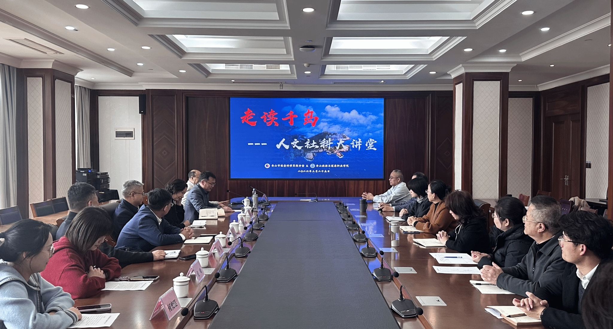 3月25日下午,由我校与市社科联共同举办的"走读千岛——人文社科大讲堂"在学校顺利举行。本次讲座以"蓝色文脉——舟山海洋文化名城的历史坐标与当代赓续"为主题,特邀浙江海洋大学中国海洋古文献研究中心主任程继红教授主讲。市社科联主席傅伊云、副主席郎勇,舟山市政协文化文史和学习委员会主任唐益鸣、副主任王文涛,学校领导郑能波、孔志华及海岛共富研究中心、海岛民宿研究中心的科研人员到场聆听。
