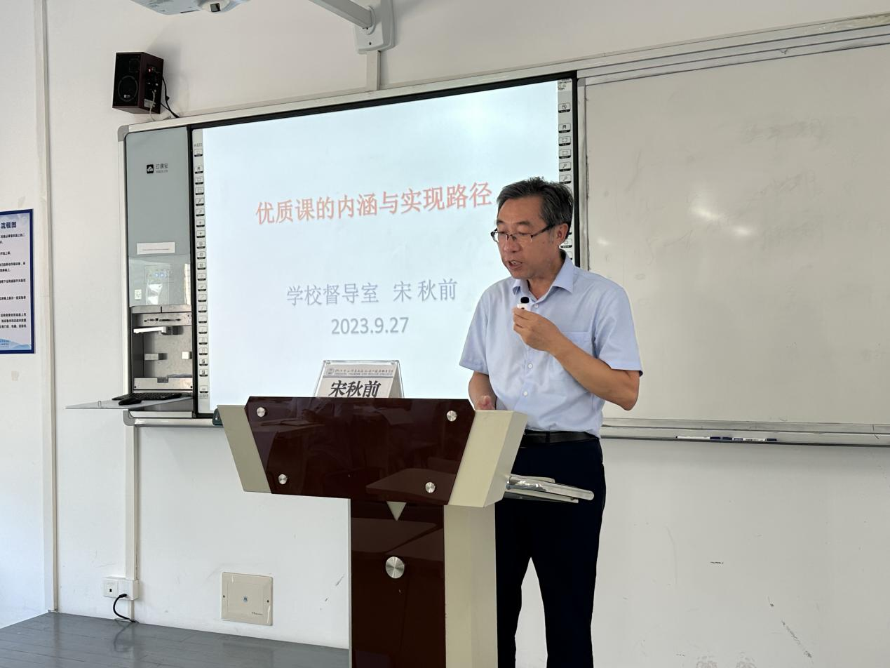 为进一步提高教师队伍的专业素养和教学能力,深化课堂教学改革,把高效课堂落到实处,切实提高教师教育教学水平,教务处(质量管理办公室)于9月27日下午在明德楼102教室组织全体教师参加2023-2024学年第一学期第二次全校性教研活动。本次教研活动邀请校教学督导宋秋前教授就关于《优质课的内涵与实现路径》的讲座。他结合自己多年来教学中积累的丰富经验,依据师生对教学内容与教学过程的决定权,学生参与课堂教学阻碍,提出了有效举措。本次教学讲座,打开了大家思路,为学校教学改革和实践起到很好的推动作用,以不断提升教育教学质量工作。